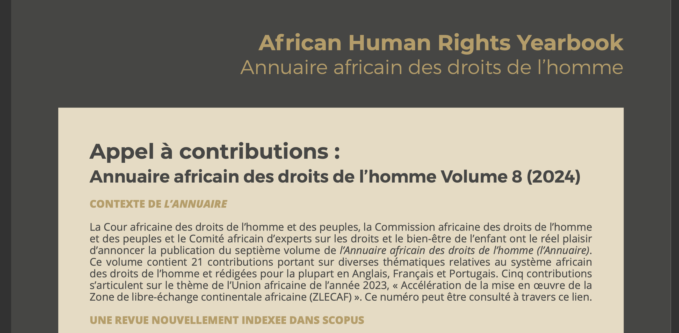 La Cour africaine des droits de l’homme et des peuples, la Commission africaine des droits de l’homme et des peuples et le Comité africain d’experts sur les droits et le bien-être de l’enfant ont le réel plaisir d’annoncer la publication du septième volume de l’Annuaire africain des droits de l’homme (l’Annuaire). Ce volume contient 21 contributions portant sur diverses thématiques relatives au système africain des droits de l’homme et rédigées pour la plupart en Anglais, Français et Portugais. Cinq contributions s’articulent sur le thème de l’Union africaine de l’année 2023, « Accélération de la mise en œuvre de la Zone de libre-échange continentale africaine (ZLECAF) ». Ce numéro peut être consulté à travers ce lien.