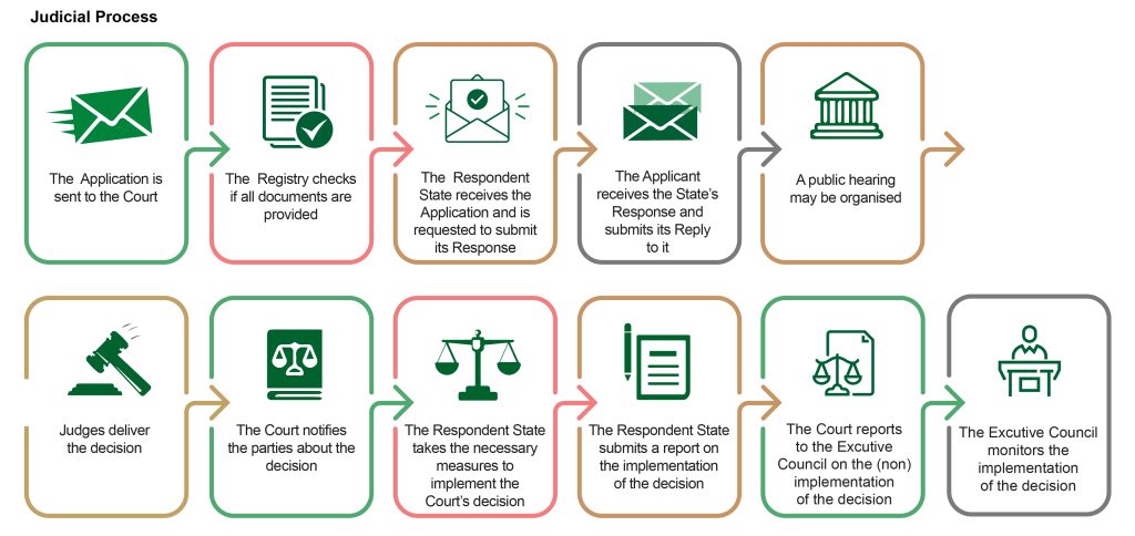 The Court may decide to hold Public hearings on its own volition or at the request of a party. The Court delivers its judgment after deliberations on the case. After the delivery of judgment, a certified true copy of the judgment is transmitted to the Parties, the African Union Member States and the Banjul Commission. Once the Parties, the AU Commission and the AU Member States are notified of the decision, the Respondent State must submit periodic reports to the Court on the implementation of the judgment within the timelines specified in their operative part of the judgment. The Applicant can file observations on the Respondent State’s reports on compliance with the judgment.