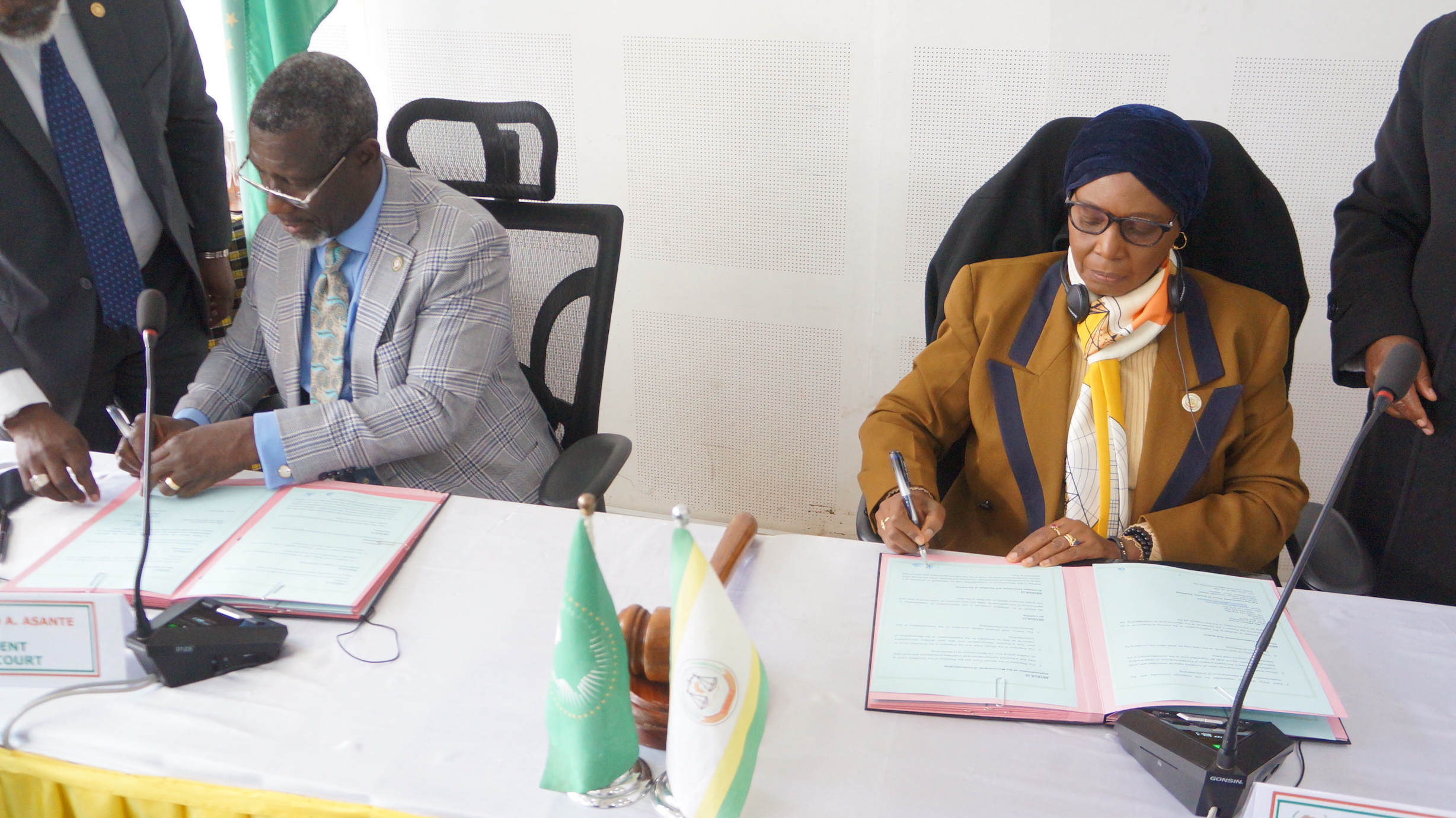 Left is the President of the ECOWAS CCJ Hon Edward Asante and the President of the African Court Hon Lady Justice Imani Aboud (r) during the signing of the MoU at the seat of the African Court in Arusha, Tanzania.