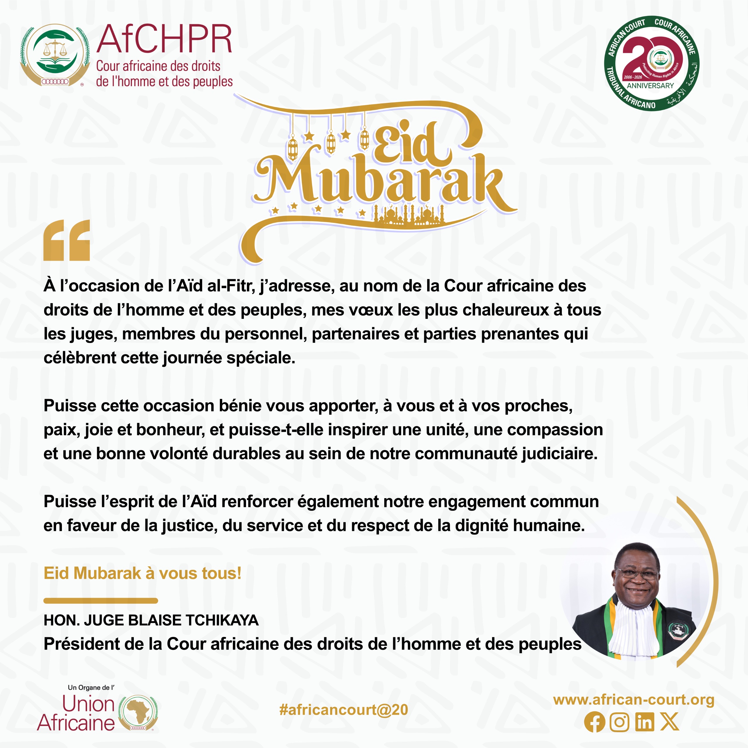 À l’occasion de l’Aïd al-Fitr, j’adresse, au nom de la Cour africaine des droits de l’homme et des peuples, mes vœux les plus chaleureux à tous les juges, membres du personnel, partenaires et parties prenantes qui célèbrent cette journée spéciale.