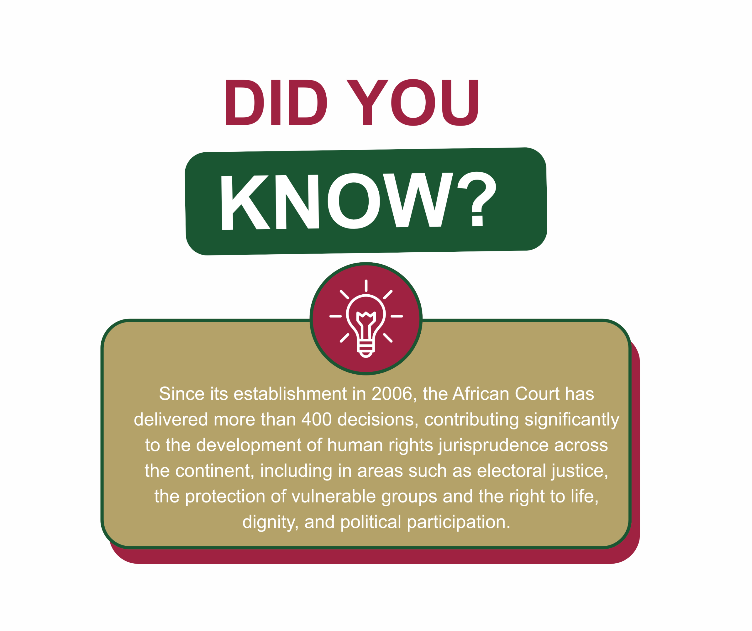 Since its establishment in 2006, the African Court has delivered more than 400 decisions, contributing significantly to the development of human rights jurisprudence across the continent, including in areas such as electoral justice, the protection of vulnerable groups and the right to life, dignity, and political participation.